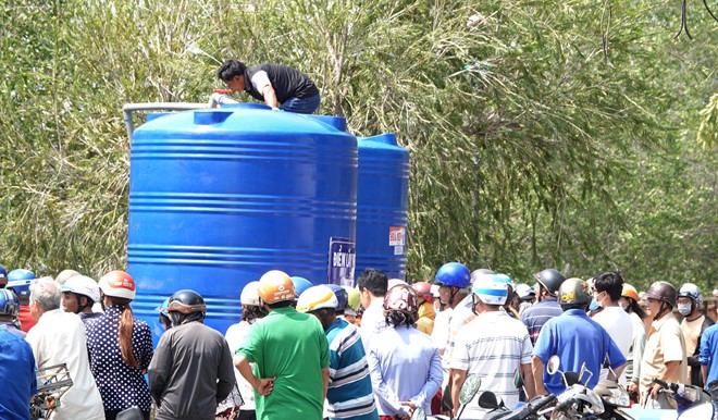 Người dân đổ xô đi lấy nước ngọt về dùng. Ảnh: Thanh Niên |