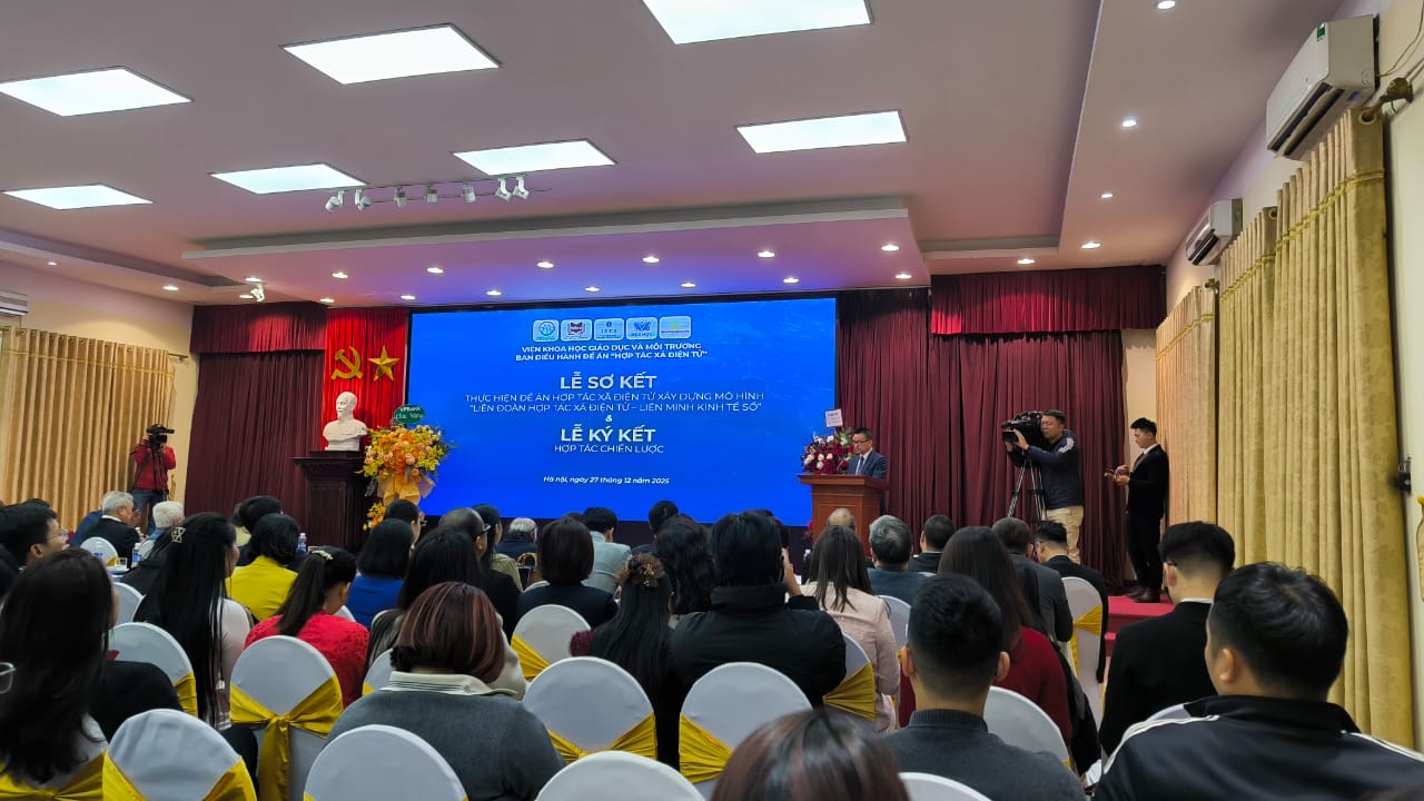 Sáng 27/12/2025, tại Hà Nội, Viện Khoa học Giáo dục và Môi trường phối hợp với Ban Điều hành Đề án “Hợp tác xã điện tử” long trọng tổ chức Lễ sơ kết thực hiện Đề án “Hợp tác xã điện tử” và ký kết hợp tác chiến lược. Sự kiện thu hút sự tham dự của đại diện các bộ, ngành, cơ quan quản lý nhà nước, các chuyên gia, nhà khoa học, tổ chức đối tác cùng đông đảo doanh nghiệp, hợp tác xã trên cả nước.